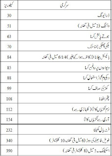 زیادہ کھانا جسم کوزیادہ کیلوریز مہیا کرتا ہے جو پیچیدگی کا سبب بنتی ہیں حالانکہ انسانی جسمکیلوریز کو بڑی کفایت شعاری کے ساتھ استعمال کرتا ہے اس کا اندازہ آپ کو درج ذیل جدول سے ہوجائے گا۔ دیئے گئے اعدادوشمار بتائیں گے کہ کس کام میں کتنی کیلوریز خرچ ہوتی ہیں۔ یہ خرچہ یا استعمال تیس منٹ کے دوران ہوتا ہے۔